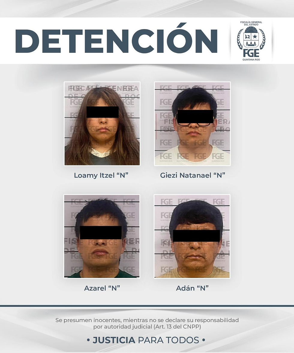 De acuerdo con la FGE, las detenciones se realizaron en menos de 14 horas tras el atraco registrado la madrugada del pasado 6 de febrero. Los señalados fueron identificados como Azarel “N”, Giezi Natanael, Adán “N” y Loamy Itzel “N”, quienes fueron interceptados en la avenida Kabah, entre Yaxchilán y Mayapán, en la Supermanzana 21 de Cancún.